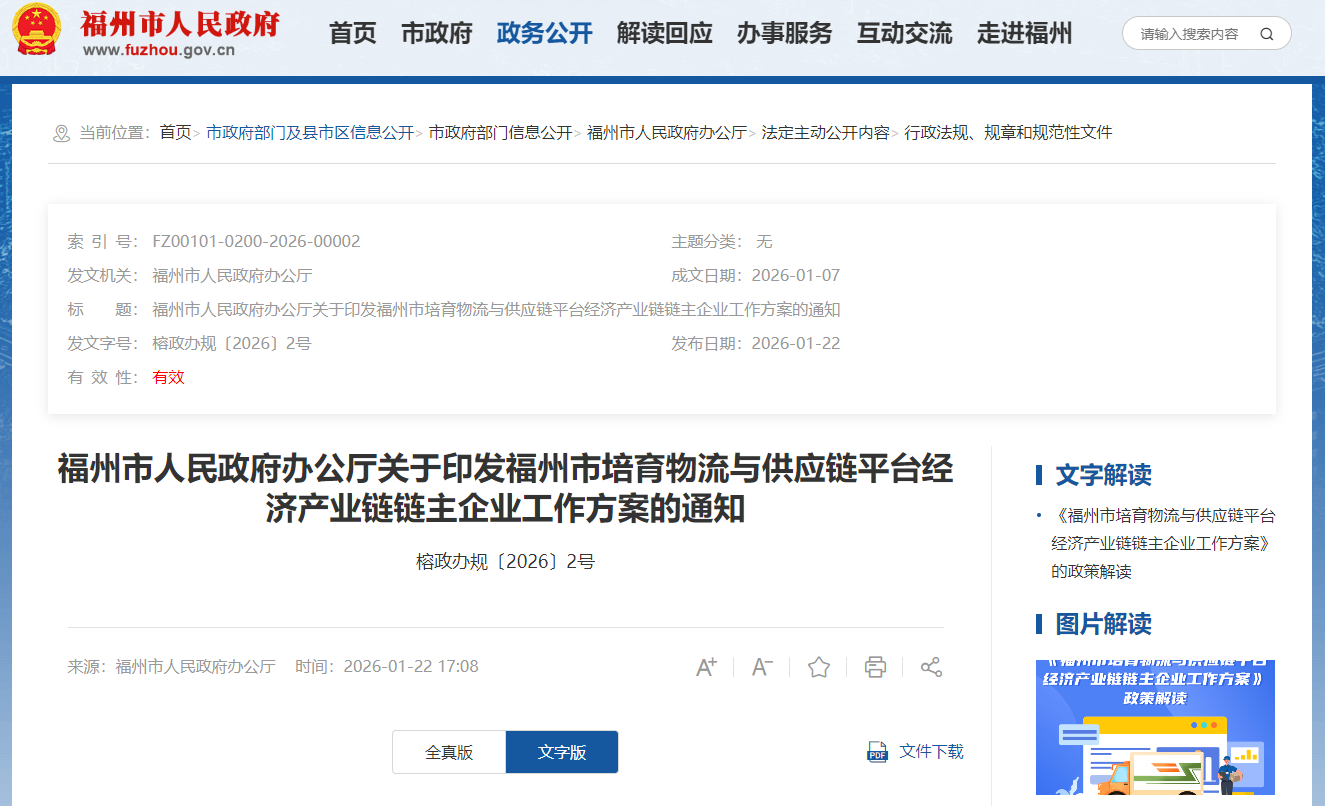 福州发布工作方案,培育物流与供应链平台经济,产业链链主企业,打造产业链集聚高地和区域品牌。