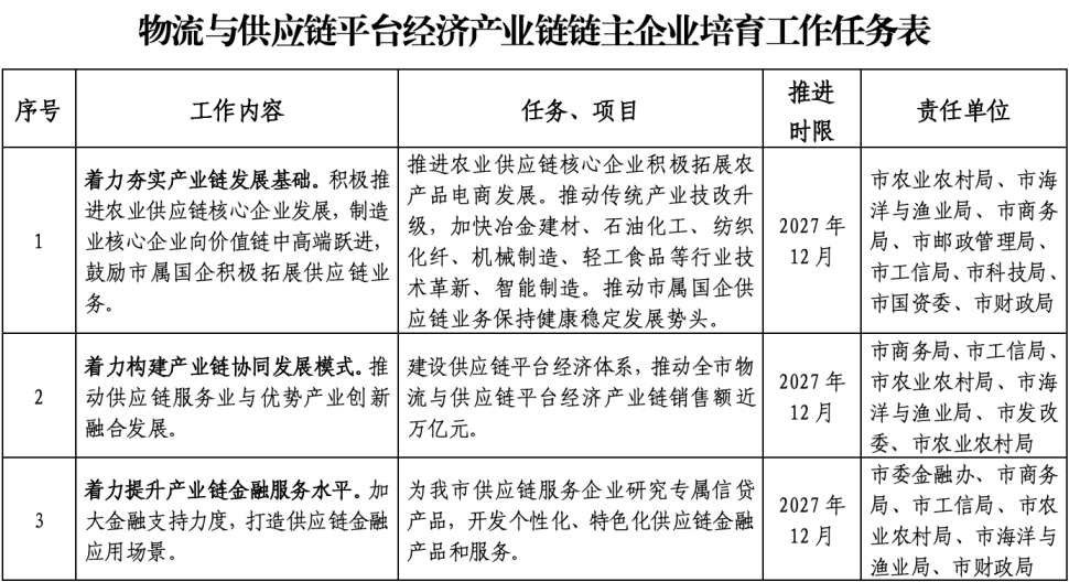 至2027年,供应链服务水平大幅提高,资源配置能力显著增强,对产业的赋能效应进一步凸显,培育壮大一批供应链核心企业和供应链服务企业。力争重点培育链主企业数达到20家,链主企业年产值(营收)总额达3500亿元,百亿供应链企业(集团)超22家。