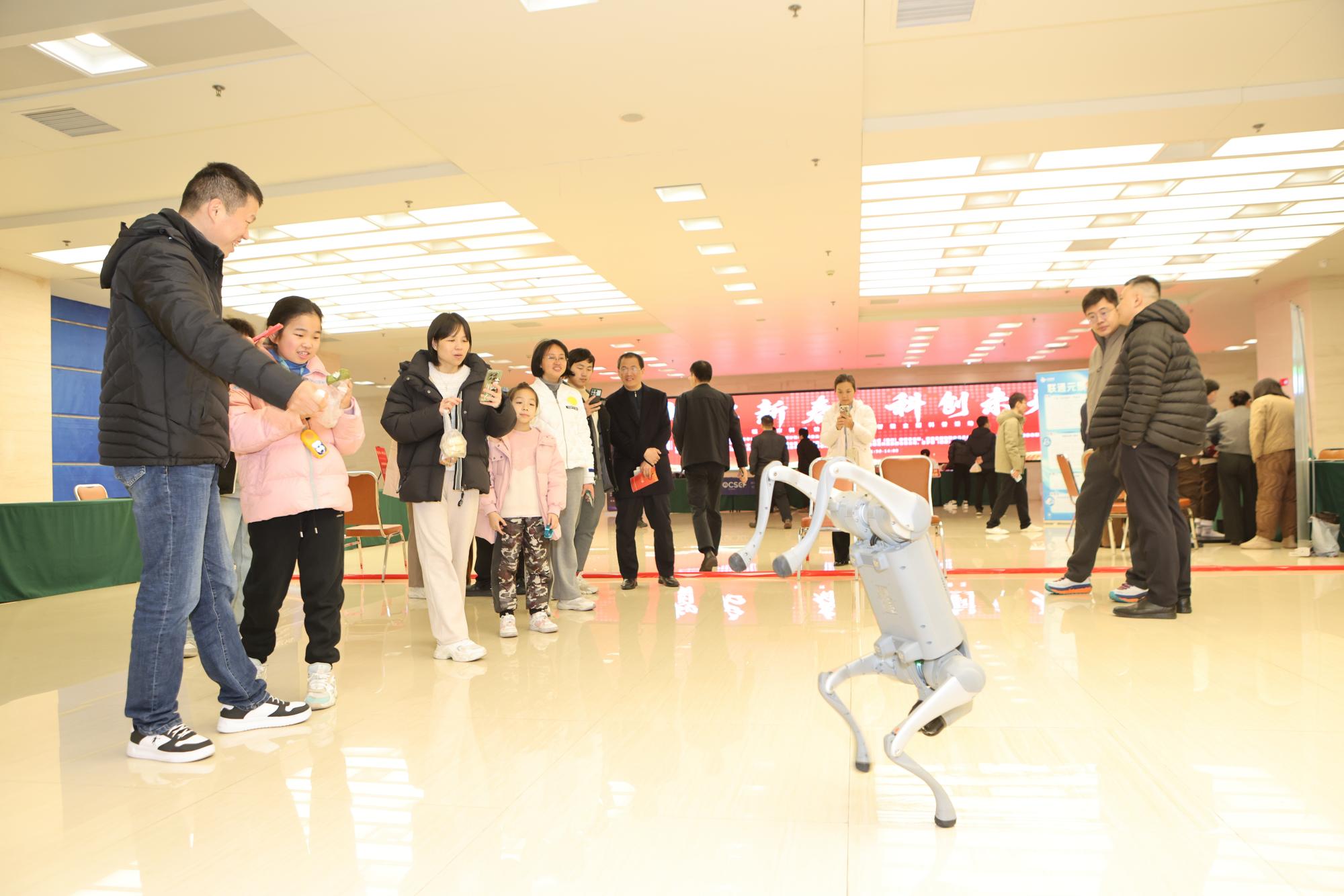 本次活动采取“知识科普+互动体验”相结合的形式,吸引了大量观众驻足参与。闽江大学带来的机器狗在小朋友的遥控下,灵活完成蹦跳、倒立、奔跑等动作,形态惟妙惟肖,吸引众多小朋友观众前来体验。星梦想(福建)创新科技展出大型服务型机器人、小型机械狗、小型机械臂以及具身智能机器人为观众带来新鲜有趣的互动体验。中国联通福州分公司推出的“AI智能量脚设备”,可在约15秒内完成脚型测量,并现场生成个性化穿鞋建议,体验者纷纷赞叹。现场还设置了AI识物挑战、福字配对消消乐等趣味互动环节,结合集章兑奖方式,让参与者在轻松愉快的氛围中学习AI知识,感受智能科技的魅力,现场人流如织,气氛热烈。