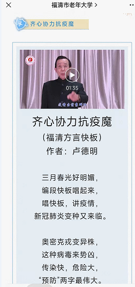 书法班教师何银祥、古典诗词班教师黄少樵都是有30多年党龄的老党员了。他们接到征集作品通知后,充分发挥党员模范带头作用创作书法、诗词作品,并发动班级学员踊跃参与。有着43年党龄的学委会主任卢德明,是一名福清民俗研究专家。他积极配合防疫宣传工作,创作了福清方言快板作品《齐心协力抗疫魔》和《创建“无疫小区”办法好》,得到广泛好评。