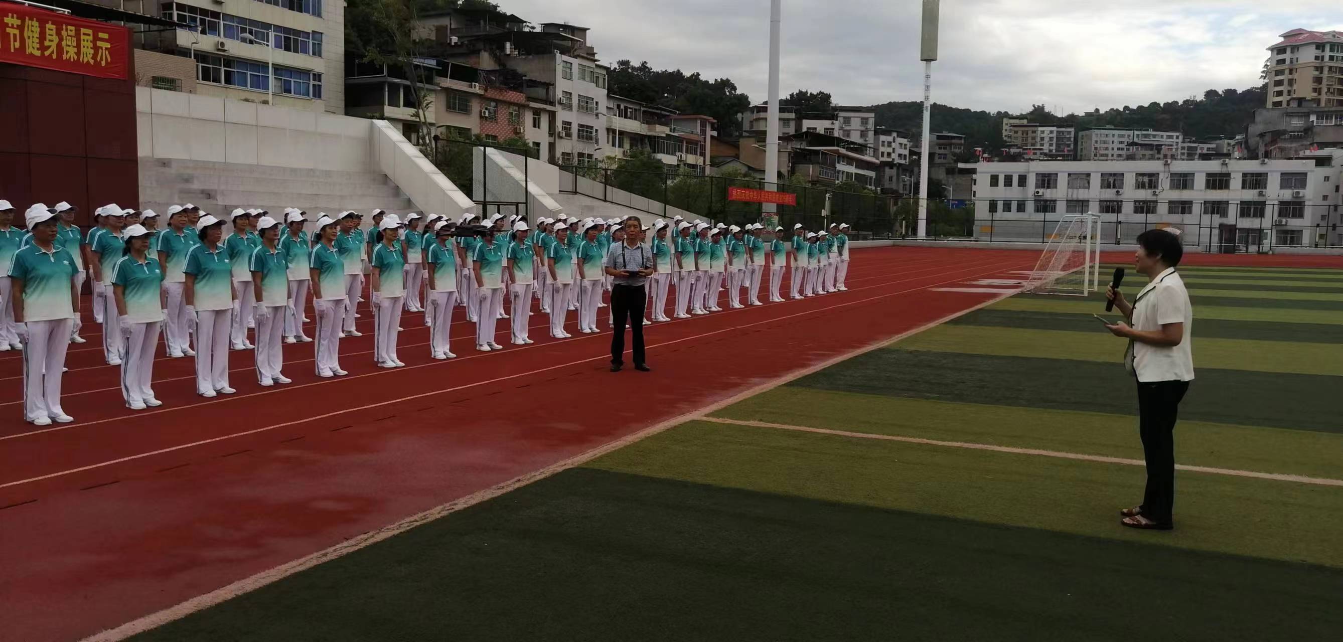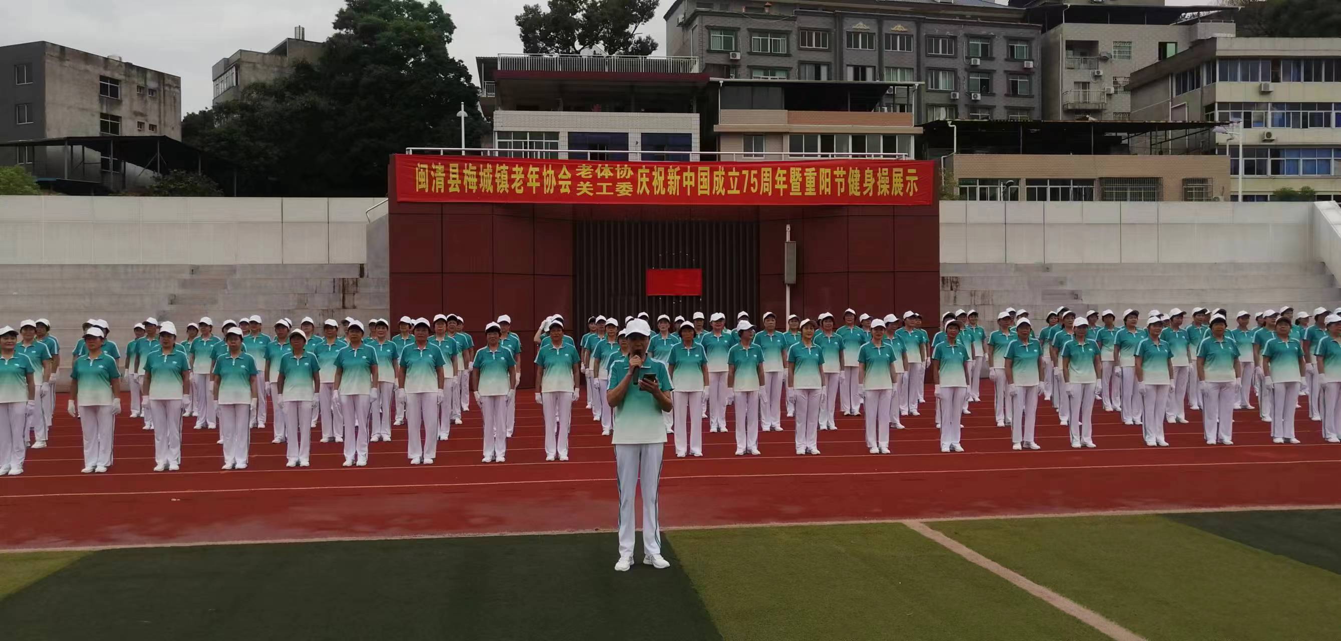 9月28日上午在县体育中心,县老年大学干部读书班的全体学员和县老体协、关工委、梅城镇老年协会共200余名同志共同参加庆祝新中国成立75周年健身操展示。