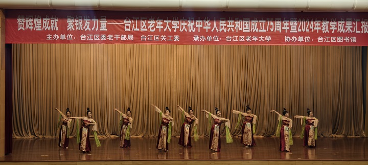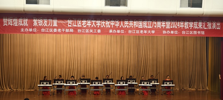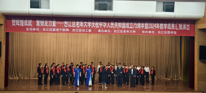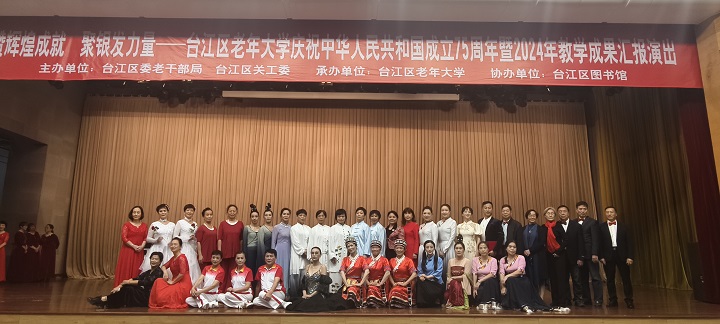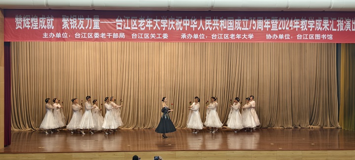 为深入学习贯彻党的二十届三中全会精神,喜迎中华人民共和国成立75周年,12月6日下午,由台江区委老干部局、台江区关工委主办,台江区老年大学承办的“赞辉煌成就·聚银发力量”——台江区老年大学庆祝中华人民共和国成立75周年暨2024年教学成果汇报演出在台江区文化活动中心一楼大礼堂成功举办。