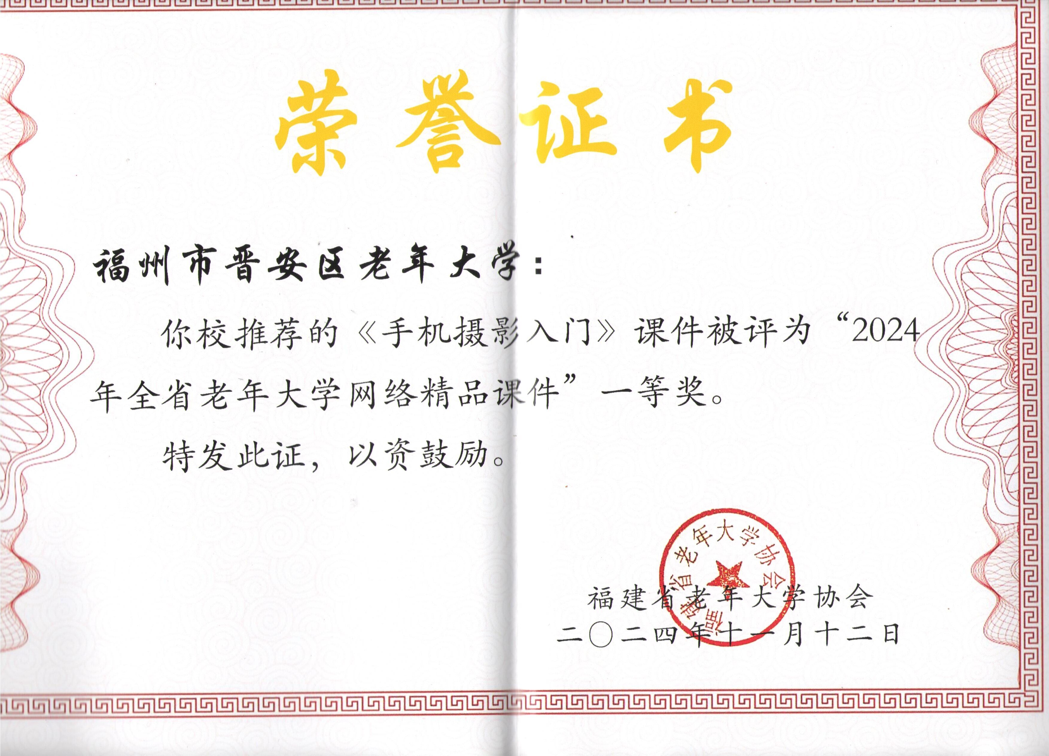 近日,在福建省老年大学协会与福建省老年大学举办的全省老年大学网络精品课件评选活动中,晋安区老年大学选送的《手机摄影入门》课件喜获一等奖。