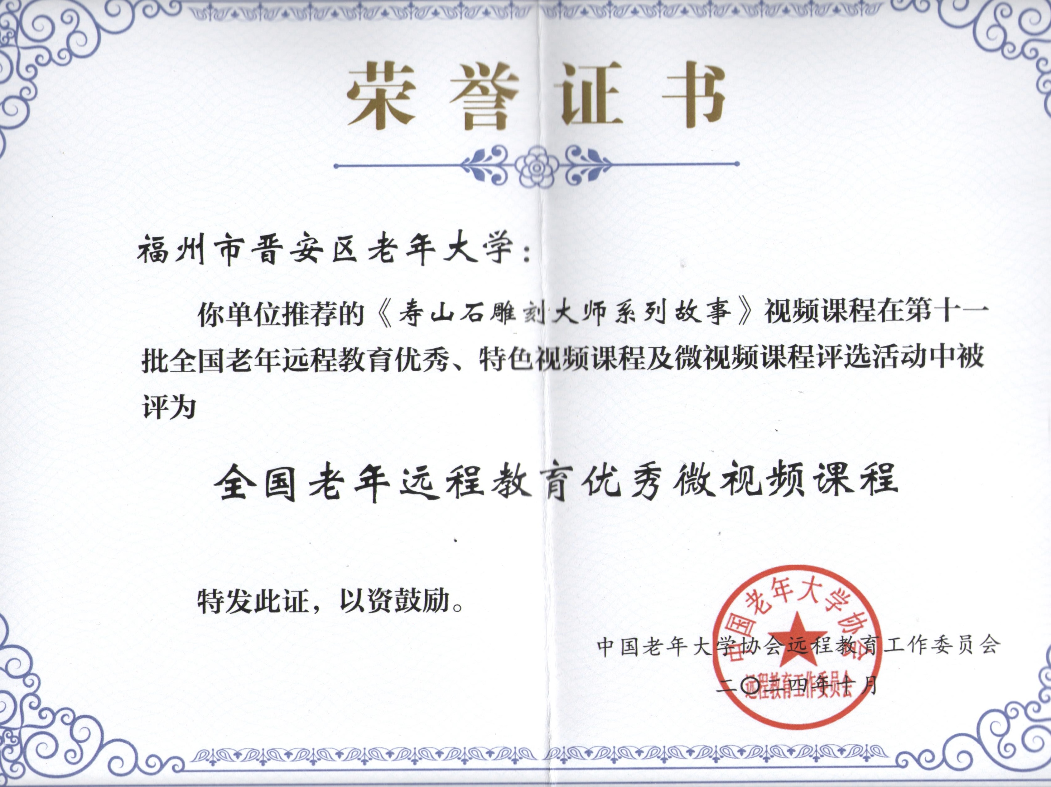 在第十一批全国老年远程教育优秀、特色视频课程及微视频课程评选活动中,晋安区老年大学选送的《寿山石雕刻大师系列故事》视频课程,被中国老年大学协会远程教育工作委员会评为“全国老年远程教育优秀微视频课程”。