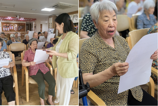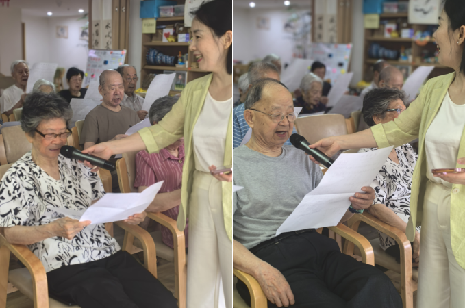 课堂上,钟凤娥老师针对高龄老人的特点,采用分句教唱与互动跟唱相结合的方式,从气息运用到情感表达逐步指导。当百岁老人陈沂爷爷轻声跟唱“天涯呀海角……”时,岁月沉淀的歌声里饱含着对往昔的温情回忆。他感慨道:“这首歌我80年前就会唱了,今天跟着老师重新学,好像又回到了年轻的时候。”