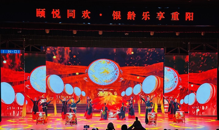 舞台之上,鼓声铿锵,豪情满怀。志愿服务队的队员们身着盛装,精神矍铄,以整齐有力的鼓点、舒展大气的舞姿,将《鼓舞中华》的豪迈气概与家国情怀展现得淋漓尽致。鼓点时而沉稳厚重,如山河屹立;时而激昂澎湃,似时代奋进,不仅赢得了现场观众的阵阵掌声,更传递出老年人热爱祖国、乐享生活的精神风貌,生动诠释了“老有所学、老有所乐、老有所为”的深刻内涵。