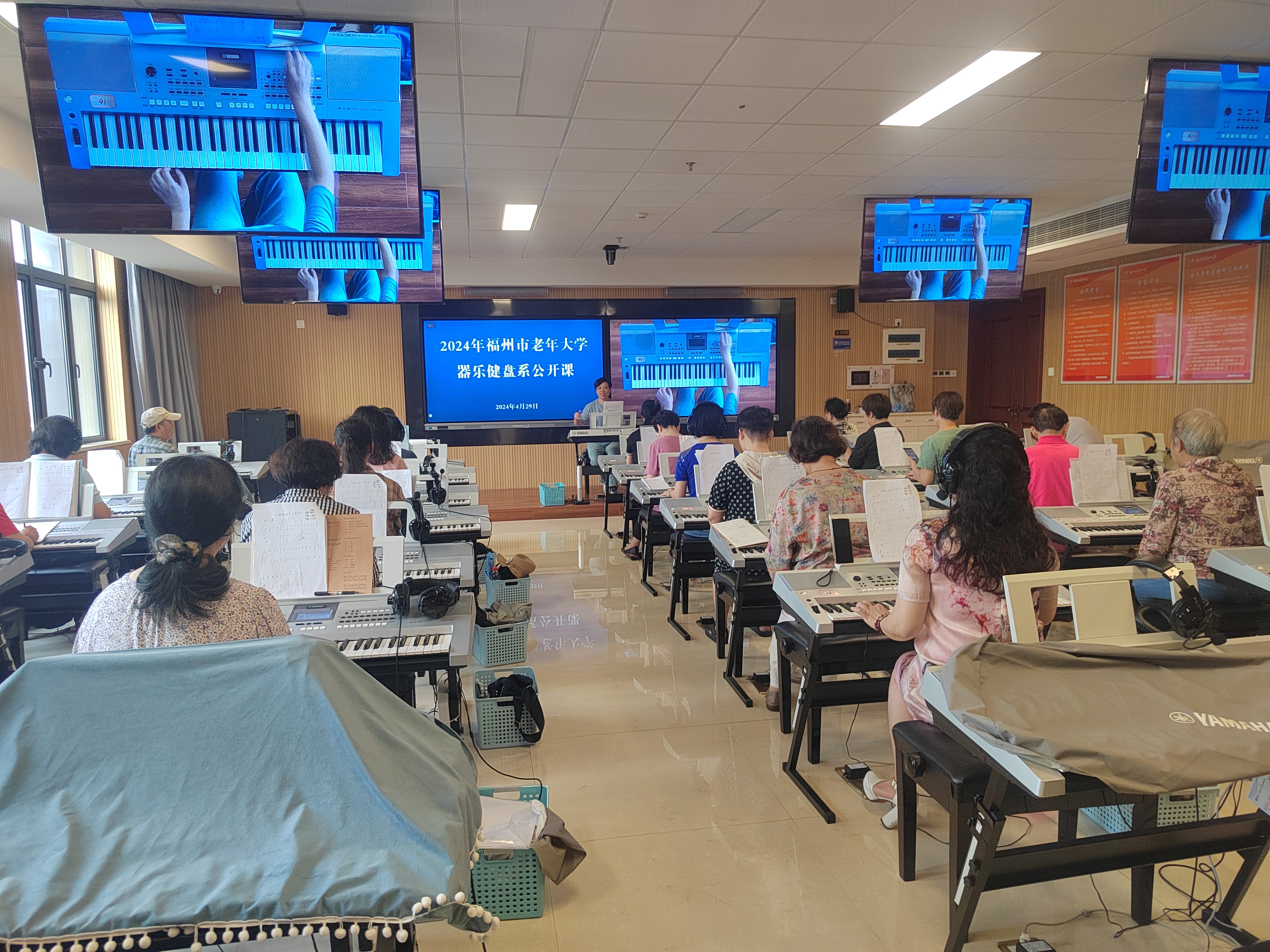 丰富的艺术实践活动可以使老年学员探究发现并领略音乐的艺术魅力,培养对音乐的持久兴趣,涵养美感,和谐身心,陶冶情操。4月29日下午,器乐键盘系电子琴基础一年1班公开课教学在林微教师声情并茂的教学中开始了。