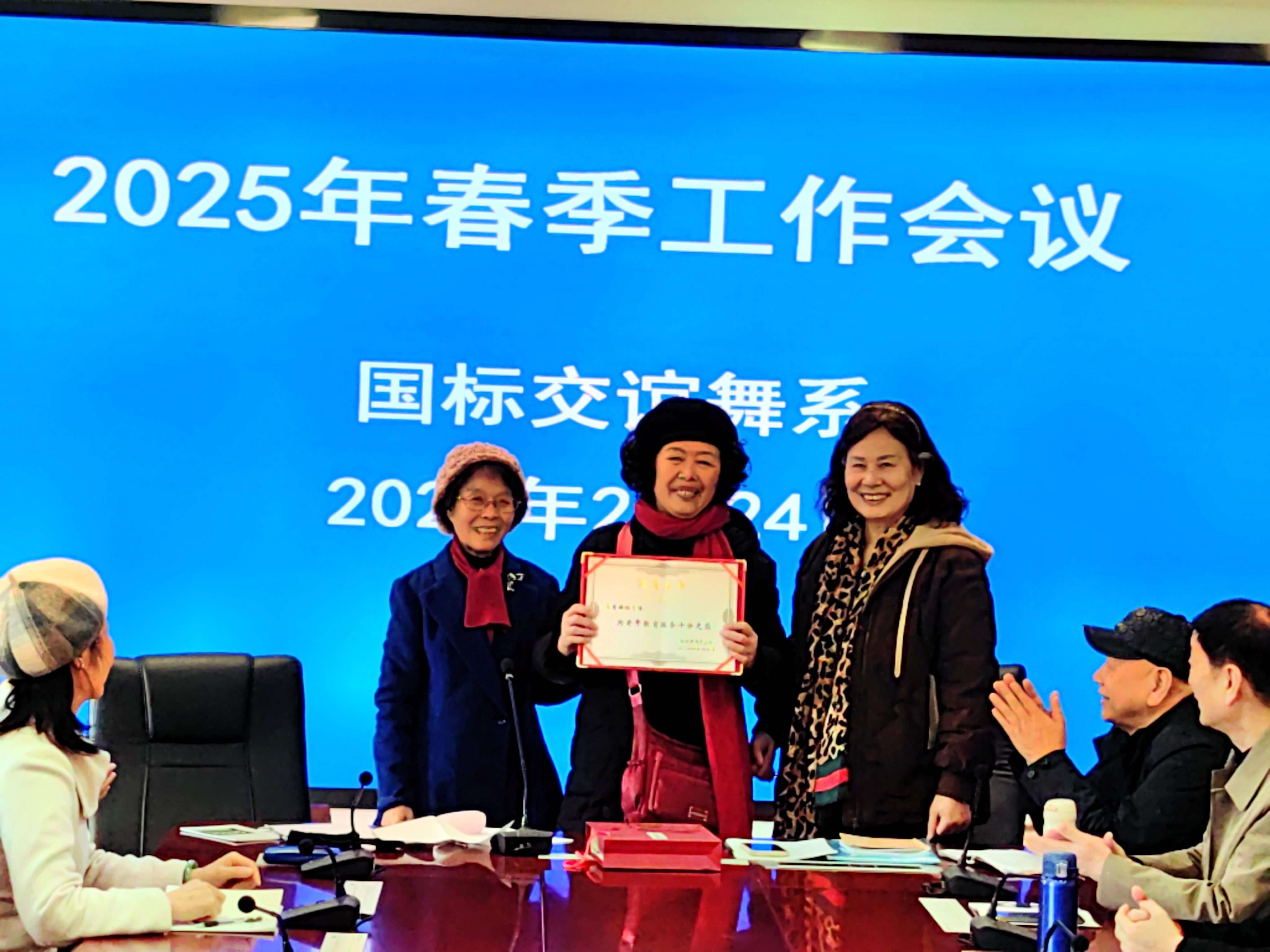会议还为两位二次退休班主任王秀丽、叶瑞妃颁发荣誉证书,感谢他们十年如一日在老年教育班主任岗位上的无私奉献。最后,会议在热烈的氛围中圆满落幕。新学期,国标交谊舞系将以迎接2026年建校40周年为契机,以“精品意识、服务意识、创新意识”为引领,团结全系师生,共同谱写老年教育高质量发展新篇章!