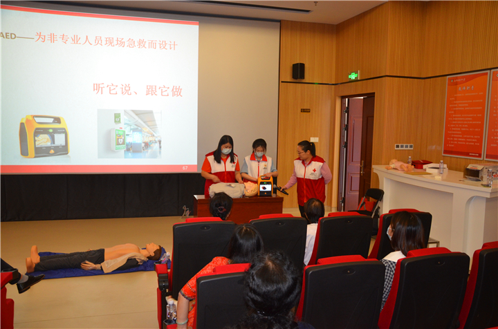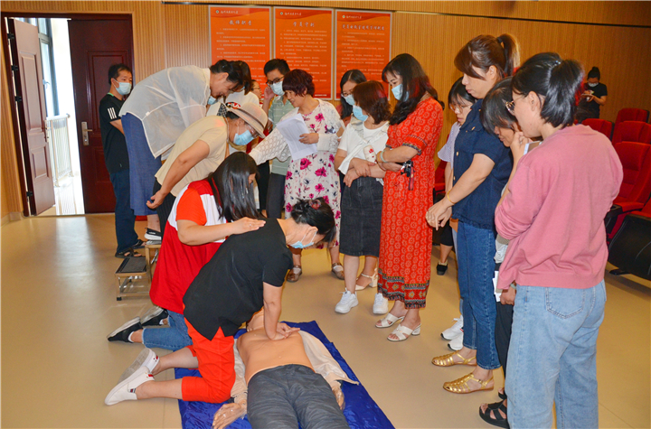 培训采用理论授课与实际操作结合方式进行。培训中,该中心专业人员结合实际案例,认真讲解基本急救知识、海姆立克急救法和心肺复苏的基本流程和步骤。利用人体模型模拟现场有人突发心跳呼吸骤停,详细演示如何实施心肺复苏及使用AED,强调了心肺复苏的适用场景、黄金4分钟内对心脏骤停患者使用AED的重要性。