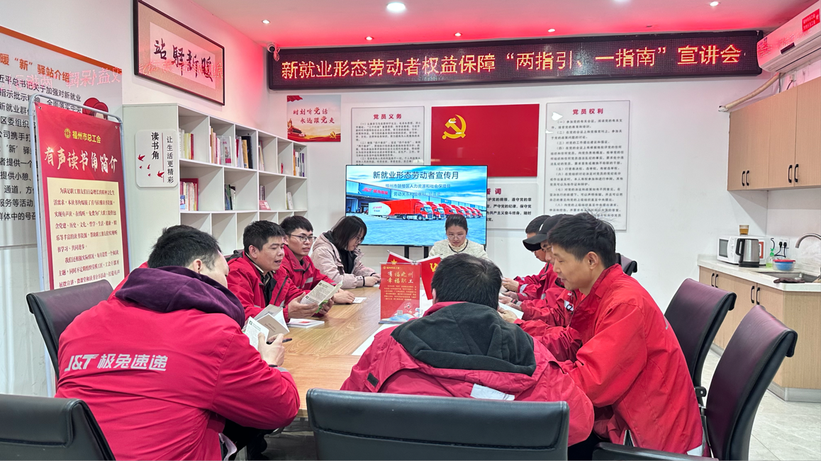 四是深入一线进企指导。晋安区人社局和晋安区总工会联合深入福州顺丰速运有限公司开展新就业形态劳动者权益保障“两指引、一指南”主题宣传活动;鼓楼区区人社局深入福州市敏锦伟业快递有限公司开展新就业形态劳动者权益保障宣传活动。工作人员现场对“两指引、一指南”等政策进行宣讲解读,向企业和劳动者发放了相关宣传册,指导企业合理制定平台算法规则,帮助企业依法依规用工。
