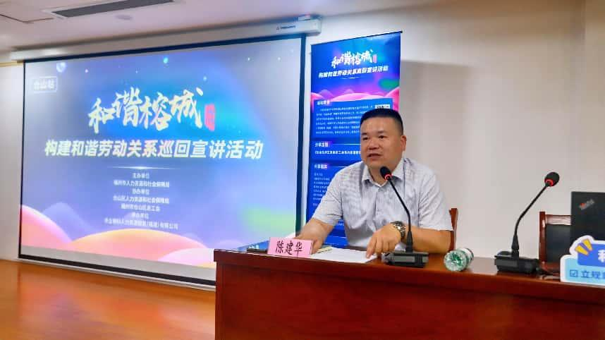 仓山区人社局党组成员陈建华对活动发表致辞并表示:构建和谐劳动关系,是当今社会发展的重要课题,对于促进企业持续健康发展和社会和谐稳定具有深远的意义。本次宣讲活动,正是我们推进福州市实施全国公共就业服务能力提升示范项目的重要举措之一。我们希望通过这样的活动,能够深入传播劳动关系专业系统知识,帮助企业和劳动者更好地了解和遵守劳动法律法规,提升企业劳动用工管理水平。