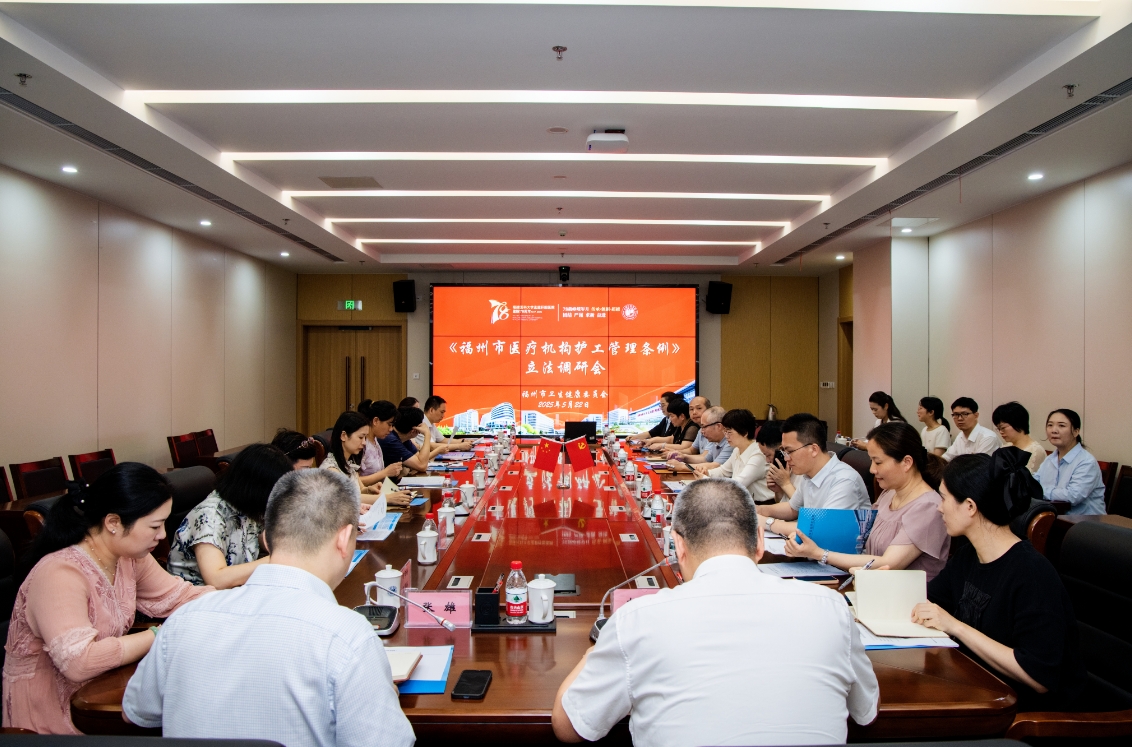 调研组在医院行政楼开展座谈会,现场听取福州市医疗护理员管理工作的整体情况,市属医院在当前医疗护理员管理工作中面临的困难和挑战,医疗护理员培训体系的建设思路和建议,医疗护理员在劳动保障、职业资格认定等方面的相关政策,以及医疗护理员行业在实际运营过程中遇到的问题和诉求。