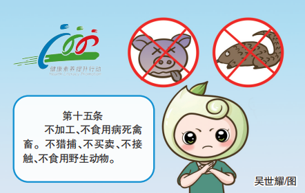 健康素养第十五条指出:不加工、不食用病死禽畜。不猎捕、不买卖、不接触、不食用野生动物。