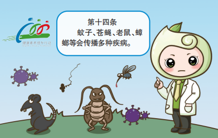健康素养第十四条:蚊子、苍蝇、老鼠、蟑螂等会传播多种疾病。
