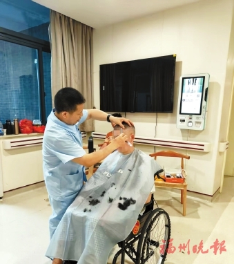 前几天的一个下午,在福州市第二总医院康复科(73区),护理员老黄在免陪照护病房的休息区长椅旁,打开橘色工具箱,将理发剪、梳子、软布等工具整齐码放后,便开始为患者剪头发。
