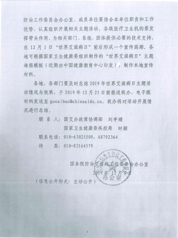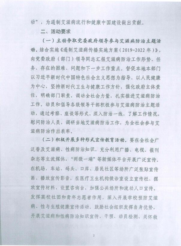 现将《国务院防治艾滋病工作委员会办公室关于做好“世界艾滋病日”主题活动的通知》(国艾办函〔2019〕9号)转发你们,请按照文件要求,认真组织开展形式多样、群众喜闻乐见的“世界艾滋病日”宣传活动,普及艾滋病防治知识和防治艾滋病的政策法规,倡导健康文明生活方式,营造良好的社会氛围,并于12月20日前将宣传活动总结材料(包括活动总结报告及活动照片等影像资料)报市防艾办。