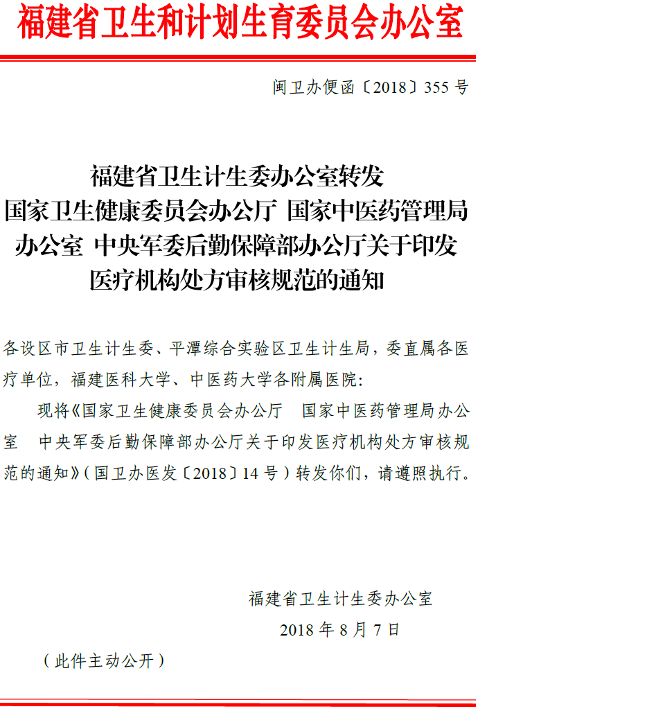 - 标 题: 福州市卫生和计划生育委员会转发国家卫生健康委员会办公厅 国家中医药管理局办公室中央军委后勤保障部办公厅关于印发医疗机构处方审核规范的通知