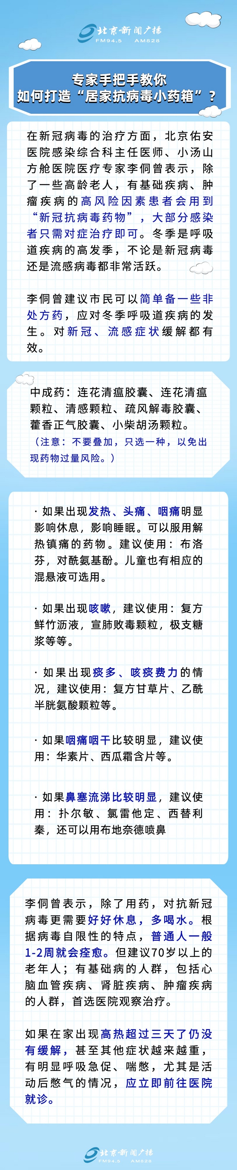 感染新冠病毒后,一般会相继出现哪些症状?到底应该如何科学用药?为应对可能发生的包括奥密克戎BF.7毒株感染在内的呼吸道传染病,大家是否需要提前准备 “居家抗病毒小药箱”?“小药箱”里应该备好哪些药物? 今天(12月4日),北京新闻广播记者韩萌专访了北京佑安医院感染综合科主任医师、小汤山方舱医院医疗专家李侗曾,国家中医医疗救治专家组成员、北京中医医院院长刘清泉。两位专家分别结合《新型冠状病毒肺炎诊疗方案》(第九版)和临床经验,做出了权威、专业的解答。