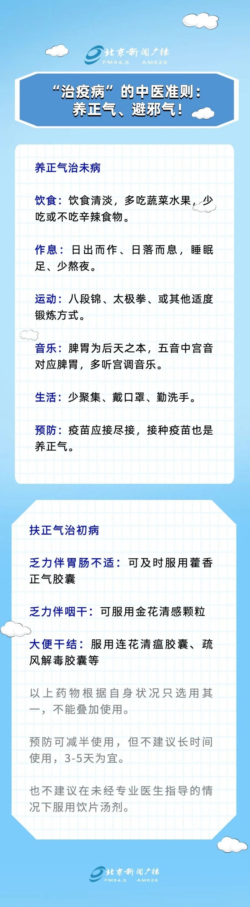 如果市民与阳性感染者密接处于医学观察期,或自认有风险点位接触。可根据不同的身体特点服用一些中成药。素常有乏力伴胃肠不适,可及时服用藿香正气胶囊;乏力伴出现咽干可服用金花清感颗粒;平常大便干结者可服用连花清瘟胶囊、疏风解毒胶囊等。调节人体的状态,养正气,减少发病的机会。以上药物根据自身状况只选用其一,不能叠加使用。