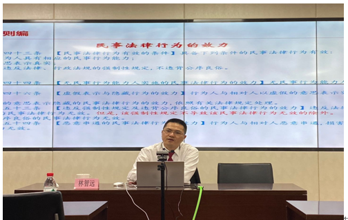 林智远副庭长着重从民法典基本原则、民事法律行为效力、境外委托代理、境外法人委托、境外证据、居住权、购房合同、车位归属、抵押权、不可抗力与情势变更、高利贷、买卖合同的风险负担、网络购物、中介合同及婚姻家事等进行了详细的解读。精彩、生动的授课获得了与会人员的一致好评。