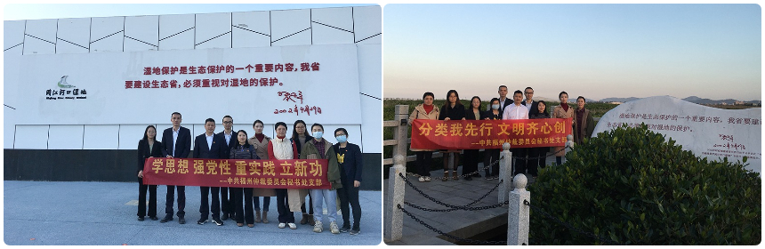 随后,读书班全体成员还前往闽江河口湿地习近平生态文明思想实践教育基地开展实地践学活动。在讲解员的引导讲解下,大家认真学习闽江河口湿地的自然资源情况,以及湿地作为候鸟迁徙重要越冬地、众多珍稀濒危鸟种的栖息地在保护生态环境、保持生物多样性中发挥的巨大作用。通过参观学习,在场党员、青年干部职工接受了一次深刻、鲜活的思想教育和精神洗礼,深感生态保护的重要性和迫切性,并在欣赏着公园美景和濒危水鸟的同时结合开展垃圾分类志愿服务活动。大家纷纷表示要积极加入保护湿地的行动中,为生态文明建设贡献自己的力量。