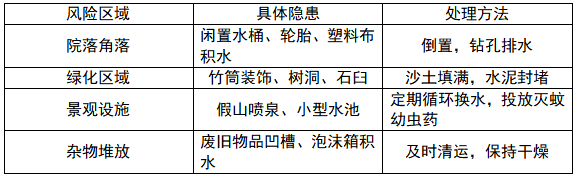 即时行动:首先雨后和洪水退后及时填平积水坑,清除所有可见积水,倒置积水的闲置容器。定期清理房屋外、公共设施周边及重点区域的积水,如垃圾站、排水排污管道等,做到不留死角,减少蚊孳生场所,从源头上控制蚊数量;