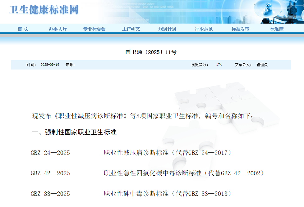 现发布《职业性减压病诊断标准》等8项国家职业卫生标准,编号和名称如下: