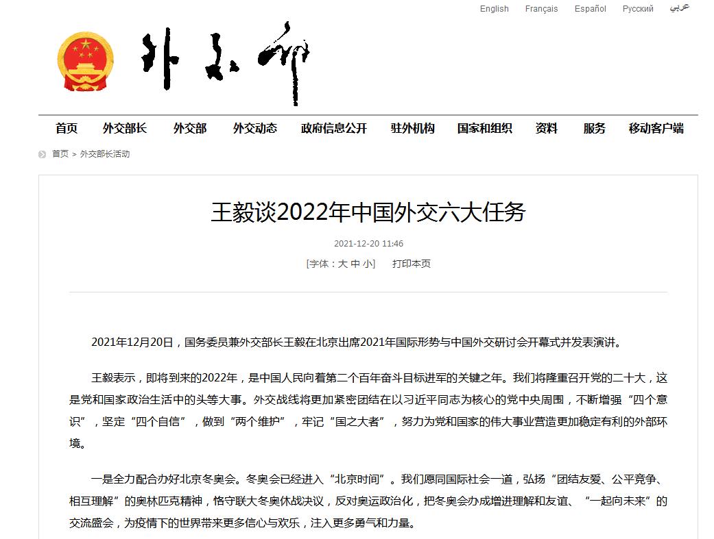 2021年12月20日,国务委员兼外交部长王毅在北京出席2021年国际形势与中国外交研讨会开幕式并发表演讲。