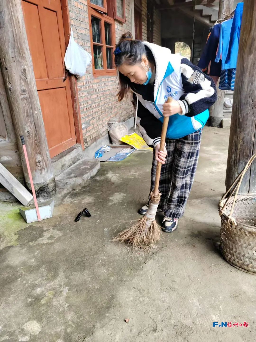 卿琴云为焦溪村的陈容花老人打扫卫生。