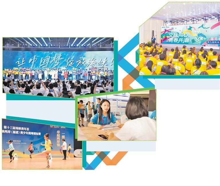 第十三届海峡青年荟主场活动海峡青年连心汇在福州举办。(资料图片)第九届两岸大学生领袖营活动在福州举办。(资料图片)闽台青年人才精准对接活动在福州海峡青年交流营地举行。(资料图片)海峡两岸(福建)青少年跳绳锦标赛在福州举办,两岸近200名青少年参赛。(资料图片)