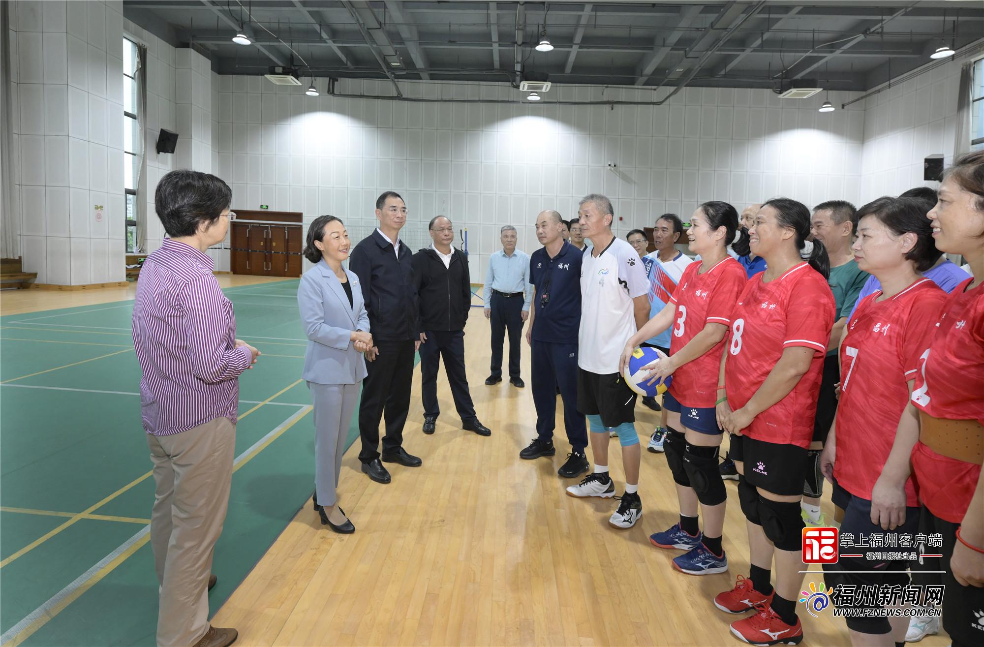 郭宁宁、吴贤德在市老年人体育活动中心与气排球爱好者交流。