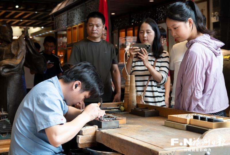 游客在三坊七巷的银饰品老铺里观看非遗手工技艺。新华社记者 魏培全摄