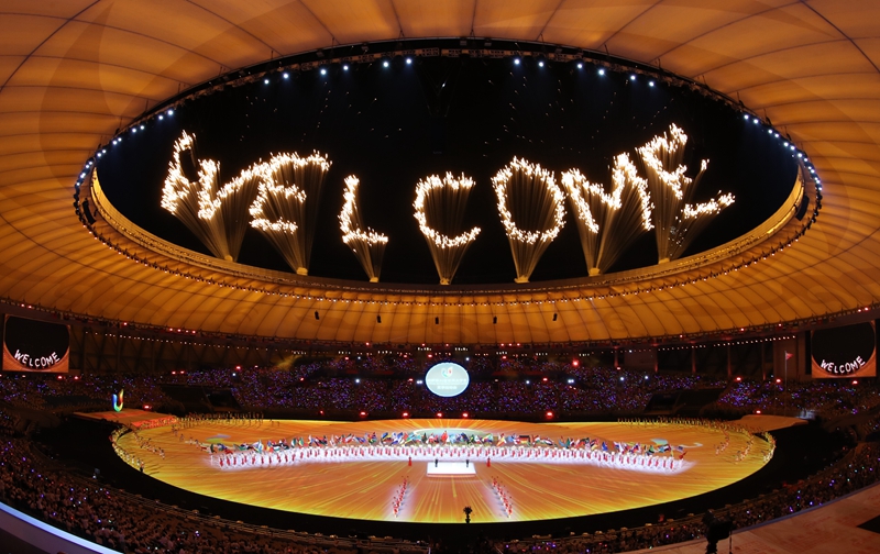 这是2023年7月28日拍摄的第31届世界大学生夏季运动会开幕式焰火。新华社记者 江宏景 摄