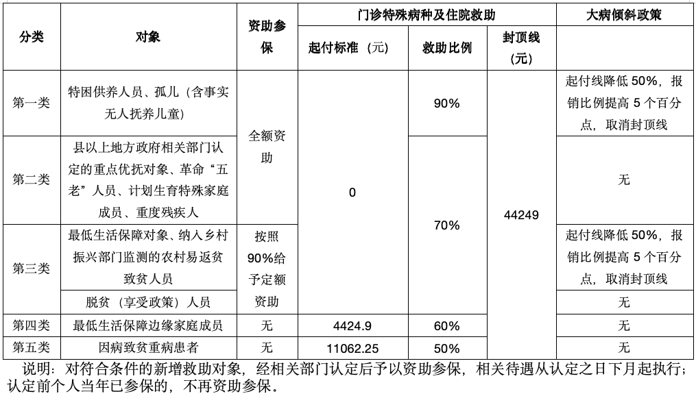 医疗救助对象:参加城乡居民医保实行财政补助政策,按规定给予分类资助。