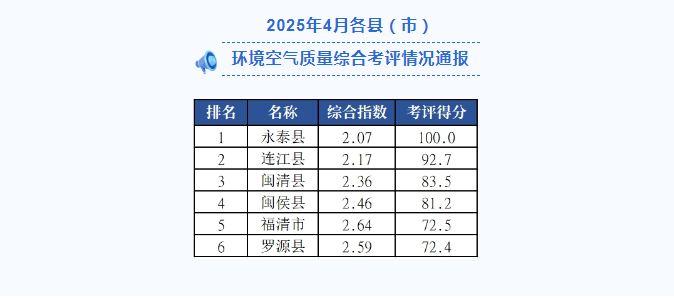 为贯彻落实党中央关于“打好污染防治攻坚战”“蓝天保卫战”精神,根据《提升福州市环境空气质量行动计划》和《福州市空气质量综合指数考评办法》,现将2025年4月及1-4月各县(市)区环境空气质量综合考评情况通报如下: