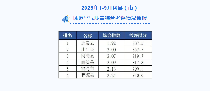 为贯彻落实党中央关于“打好污染防治攻坚战”“蓝天保卫战”精神,根据《提升福州市环境空气质量行动计划》和《福州市空气质量综合指数考评办法》,现将2025年9月及1-9月各县(市)区环境空气质量综合考评情况通报如下: