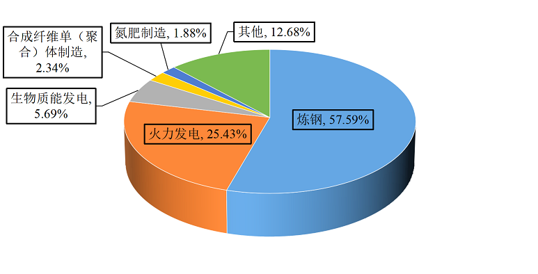 2024年,一般工业固体废物产生量排名前5的行业依次为炼钢、火力发电、生物质能发电、合成纤维单(聚合)体制造、氮肥制造,分别占全市一般工业固体废物产生量的57.59%、25.43%、5.69%、2.34%、1.88%,详细情况见图1。