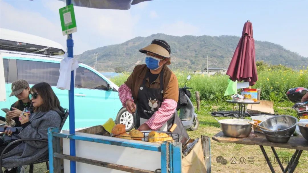 现做的锅边和油饼、房车咖啡店、绿色蔬菜……花田周边自动聚集起赏花游“周边产品”。