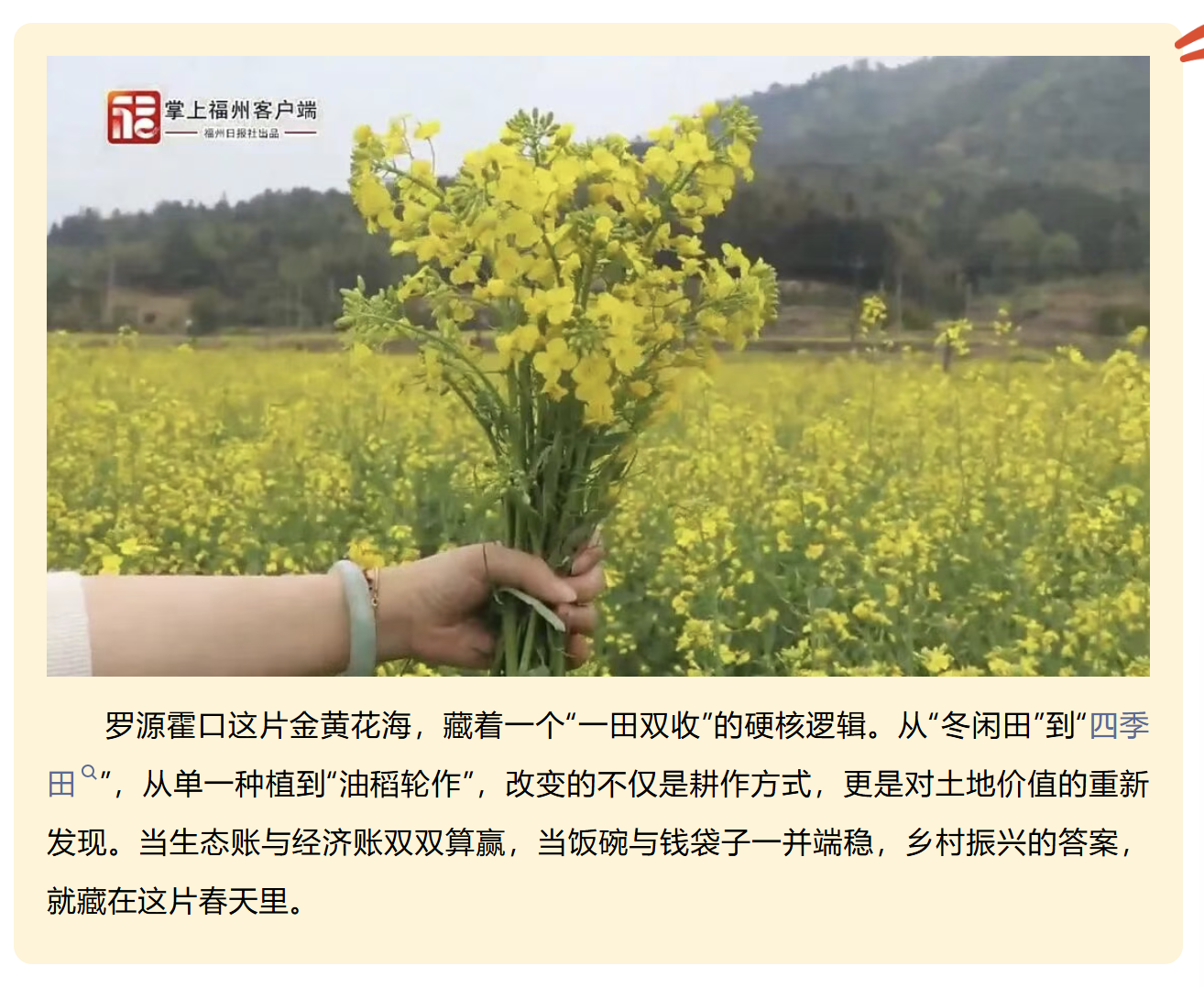 罗源霍口这片金黄花海,藏着一个“一田双收”的硬核逻辑。从“冬闲田”到“四季田”,从单一种植到“油稻轮作”,改变的不仅是耕作方式,更是对土地价值的重新发现。当生态账与经济账双双算赢,当饭碗与钱袋子一并端稳,乡村振兴的答案,就藏在这片春天里。